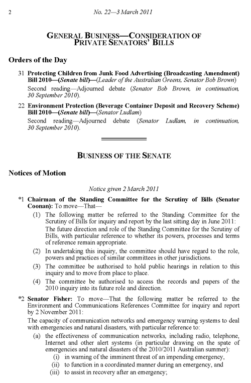 First page, Senate Notice Paper - No. 22 - 3 March 2011