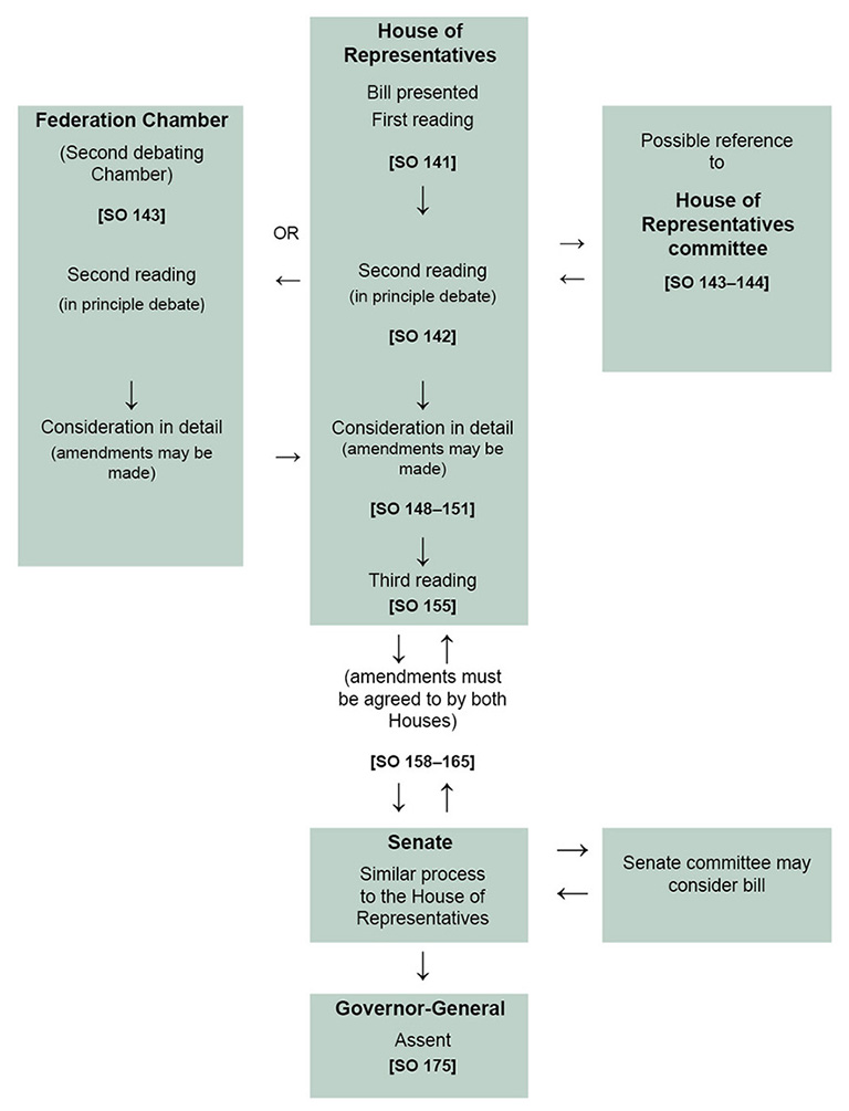 The normal flow of the legislative process is that a bill (a draft Act, or, in the terminology of the Constitution, a proposed law) is introduced into one House of Parliament, passed by that House and agreed to (or finally agreed to when amendments are made) in identical form by the other House. At the point of the Governor-General’s assent a bill becomes an Act of the Parliament. (The legislative process is presented in diagrammatic form on the back inside cover.)