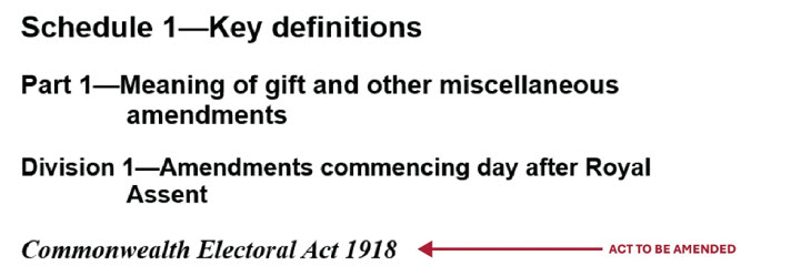 If used, the most common groupings are Parts and Divisions. A bill of this type may also have one or more Schedules at the end, containing material which will form part of the Act but which is convenient to present separately from the main body. Examples include the texts of treaties or other international agreements being incorporated into Australian law, proformas such as the ballot papers and nomination forms in Schedule 1 to the Commonwealth Electoral Act 1918 or self-contained rules relating to particular matters referred to in the main body, such as the conditions applying to the various types of broadcasting licenses in Schedule 2 of the Broadcasting Services Act 1992. The parts of a Schedule are also usually called "clauses" and continue to be so called even after enactment.