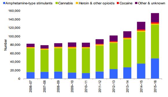meth/amphetamine from 2.1 per cent in 2013 to 1.4 per cent in 2016. Data