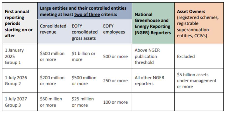 - Schedule 4 of the Bill empowers the Australian Accounting Standards Board to issue internationally aligned sustainability reporting standards that large Australian businesses and financial institutions must comply with. If enacted, large businesses will need to prepare an annual sustainability report to disclose their climate risks and opportunities in accordance with the new reporting standards. The Australian Government’s policy intention is to improve the quality and comparability of climate-related financial disclosures across different companies and sectors, which, in turn, should help investors make more informed decisions.